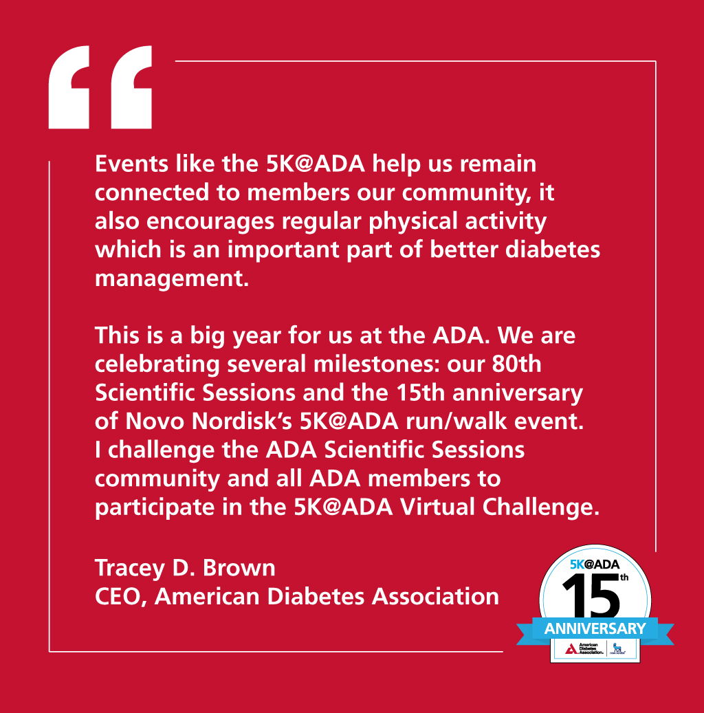 ![]() Thank you to everyone who joined us for the first annual 5K@ADA Virtual Challenge. Together, over 4,000 people joined us running and walking to raise diabetes awareness on this 15th Anniversary edition. On behalf of the American Diabetes Association and Novo Nordisk, we thank you for your continued support of the 5K@ADA and look forward to seeing you in Washington, D.C. for the ADA 81st Scientific Sessions.
